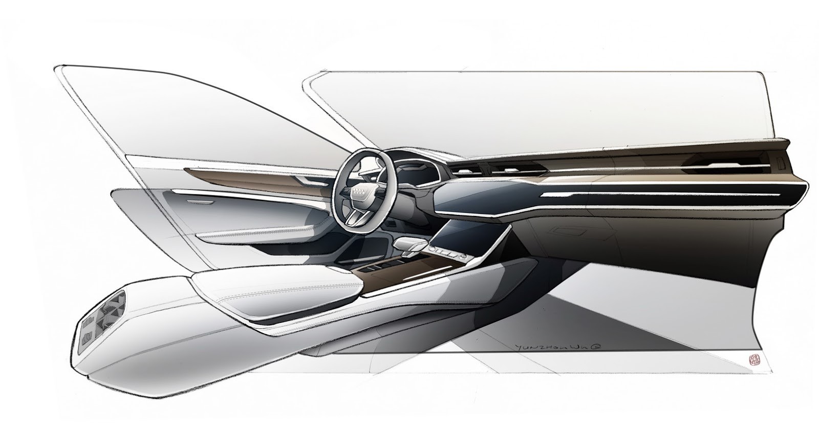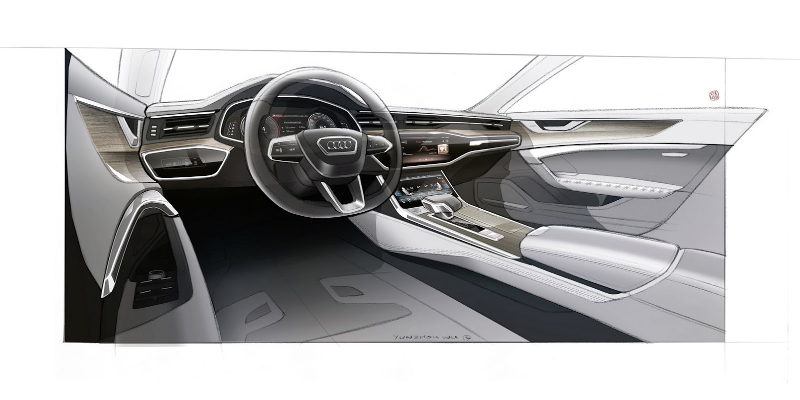 Wnętrze A7 Sportback zostało zaprojektowane w minimalistycznym stylu, z naciskiem na poziome linie i elegancki panel obsługi. To wszystko ma dawać poczucie przestronności. Kolory, materiały tapicerskie i poszczególne elementy mają odzwierciedlać nową estetykę.