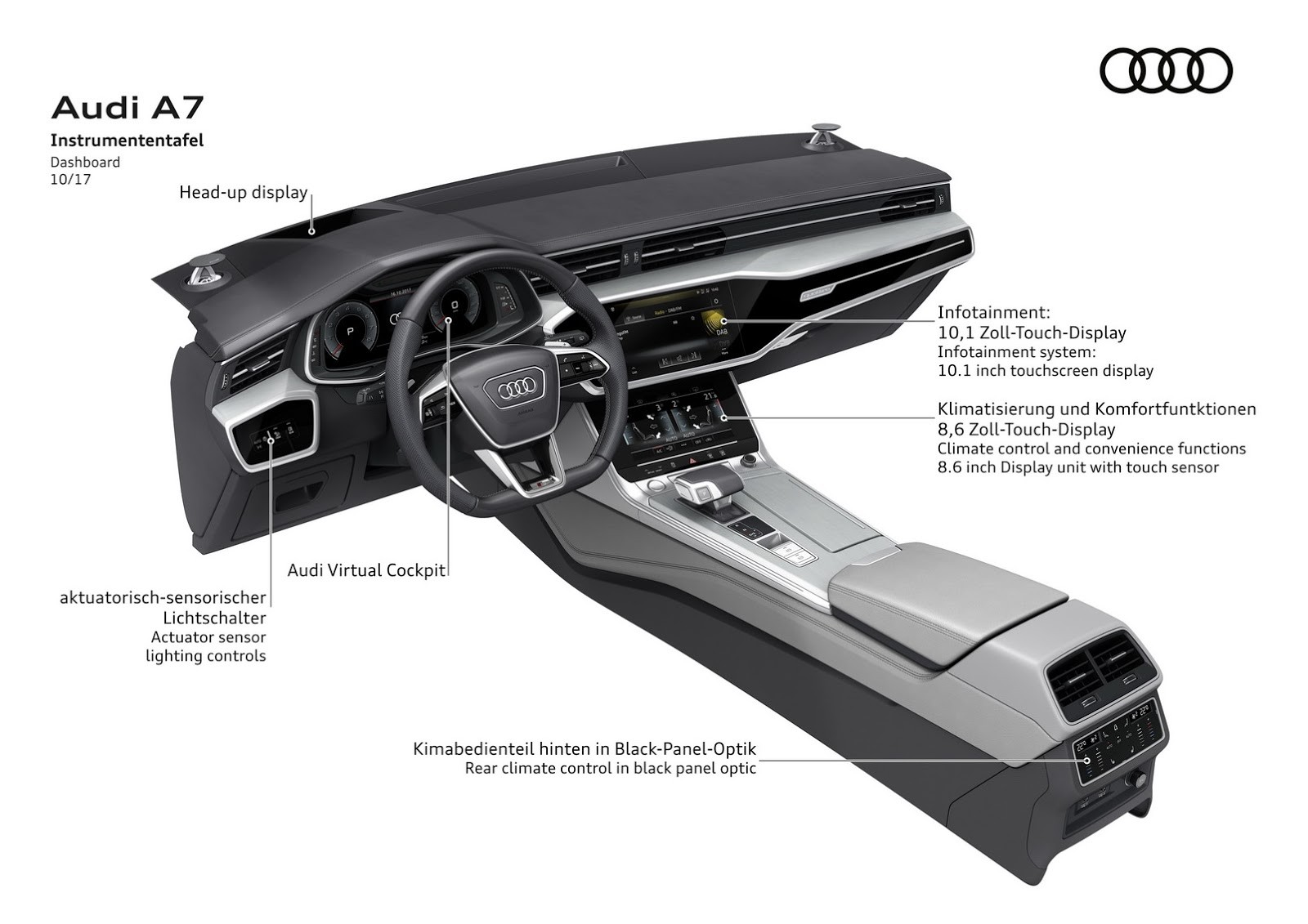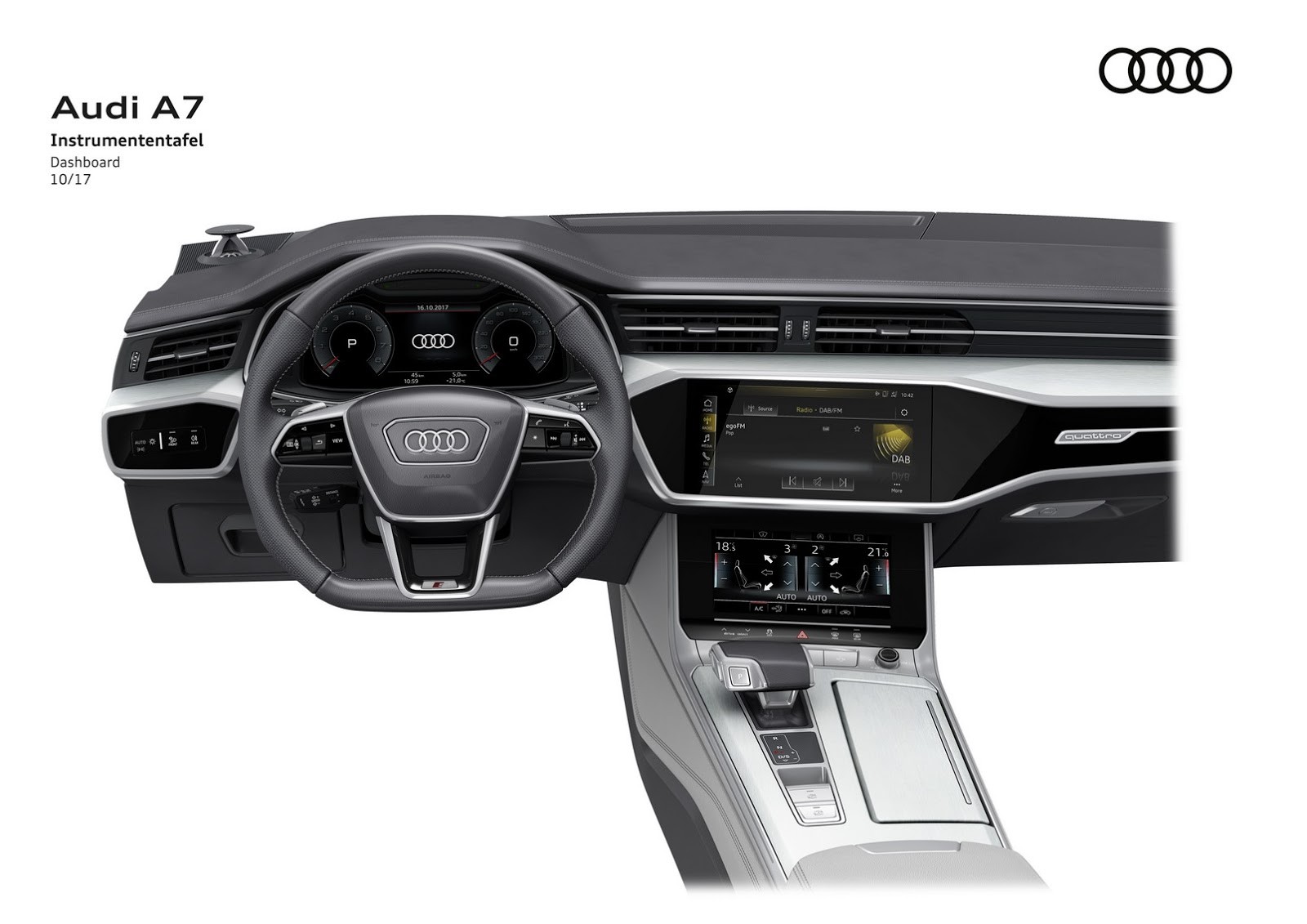 Nowością są dwa dotykowe ekrany o przekątnych 10,1 cala i 8,6 cala. Ten pierwszy, znajdujący się nad drugim, ma spełniać standardową rolę – pozwoli na konfigurację ustawień, wybór celu nawigacji, zmianę źródła audio, czy wprowadzenie częstotliwości stacji radiowej. Za pośrednictwem mniejszego z kolei będzie można sprawować pieczę nad ustawieniami klimatyzacji, czy dodatkowymi funkcjami (np. ogrzewanymi i wentylowanymi fotelami).